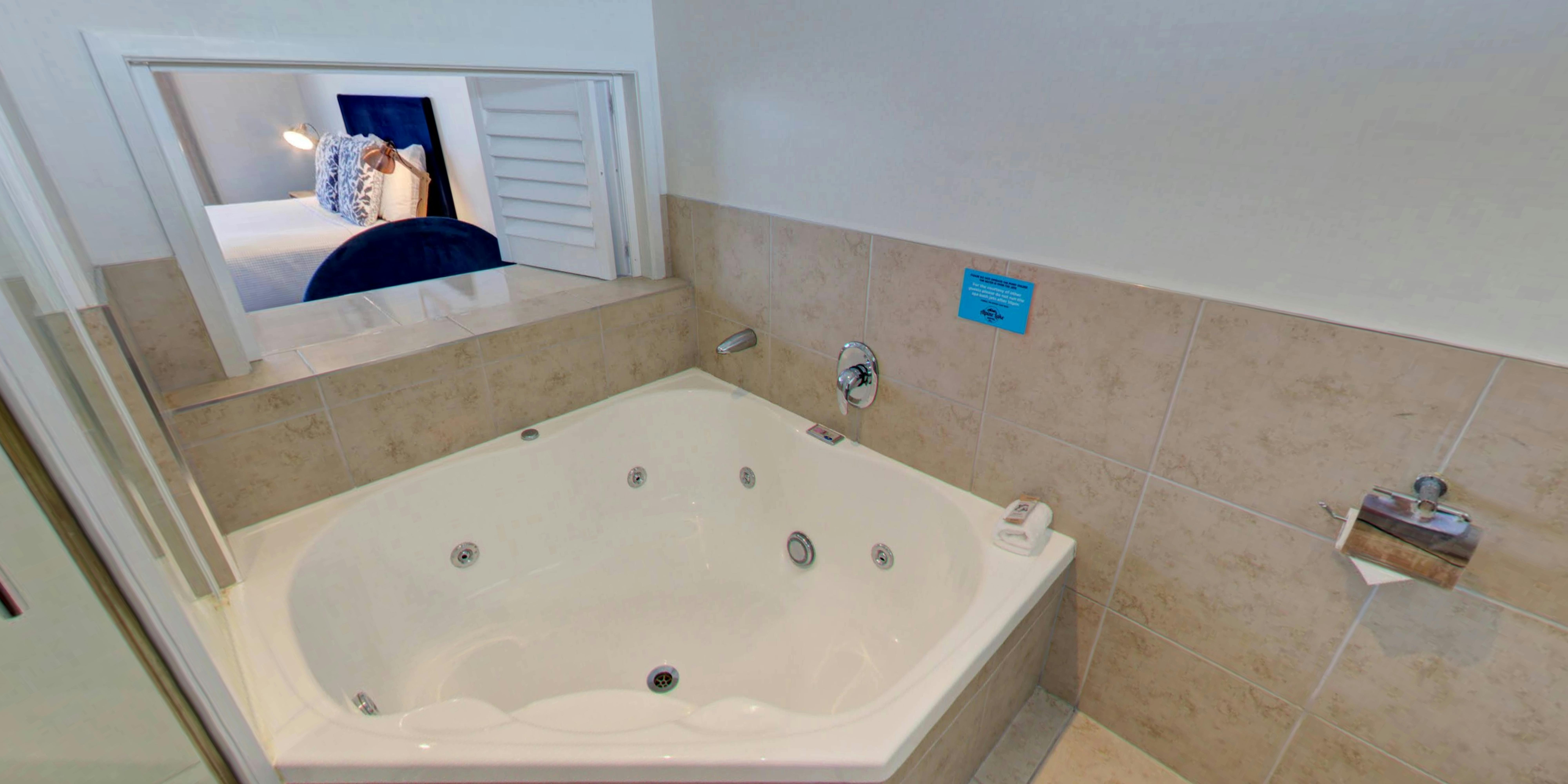 UPPER LEVEL. Stylish studio with kitchenette, queen bed and a spa bath with TV viewing window with shutters. Sleeps 2 persons.