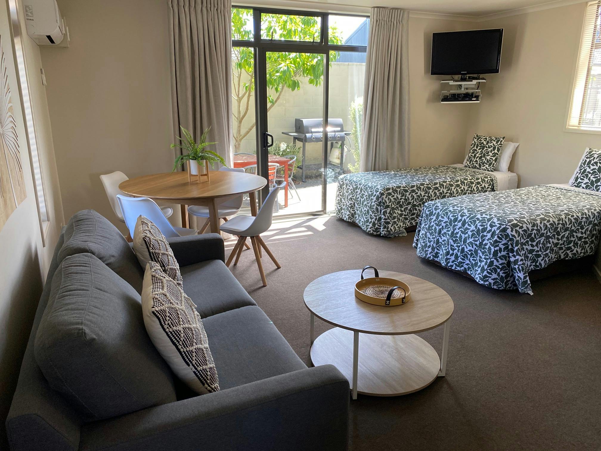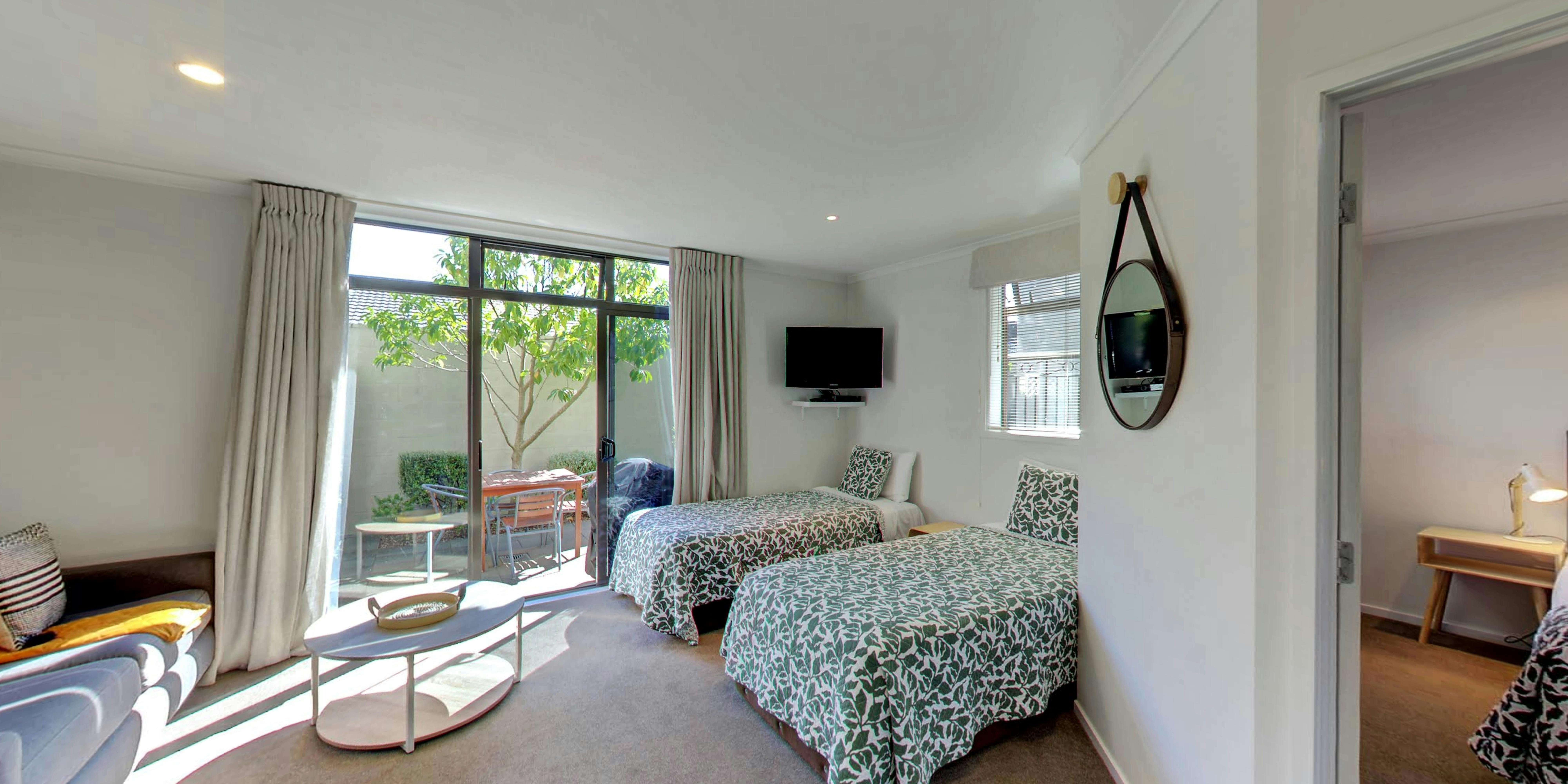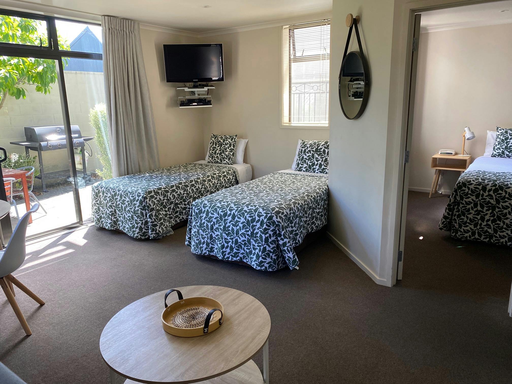 GROUND FLOOR. This suite opens onto a spacious private courtyard with BBQ facilities. Twin single beds are in the lounge area and a King size bed is in the bedroom, along with a 2nd TV. Spa bath and separate shower in the bathroom. Kitchen with ceramic hob and microwave. Set back from the road and one of our quietest rooms. Sleeps 4.